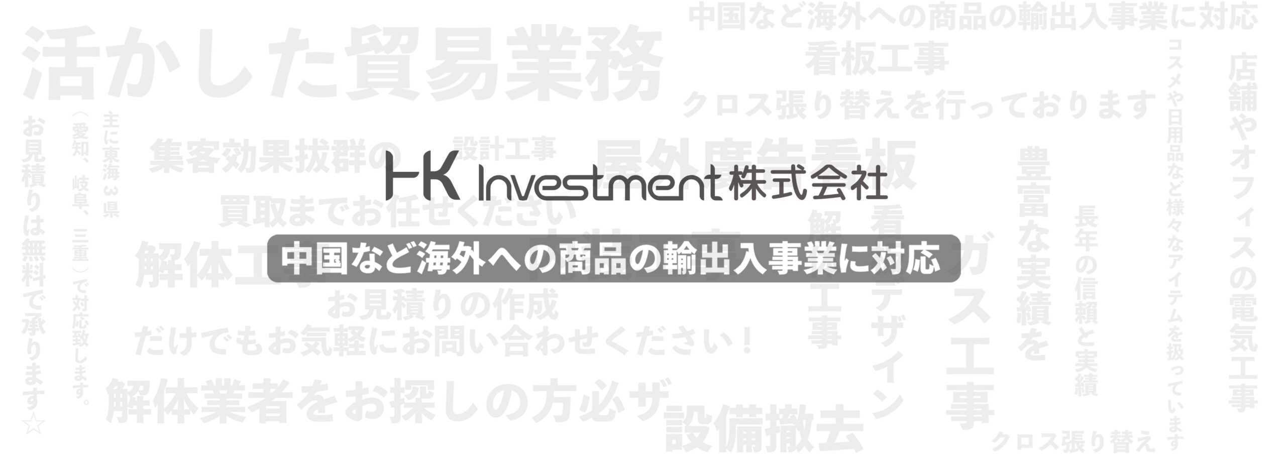HK Investment株式会社では貿易のエキスパートとして名古屋を拠点に長年経験を積んでまいりました。通関を自社で行っており、正規のルートを通すことでより長く利益を出していただけます。目先の利益ではなく、ベナルティーをしっかりと回避した方法で輸出入をサポートいたします。 また、建設業、重量物の運搬も承っております。エアコンの取り付けから店舗の解体や内装工事まで幅広いご要望にお応えすることはもちるん、電気やガスの施工等も專門知識を持つスタッフと連携しながらサポートしております。ご相談・ご質間など、どうそお気軽にお問い合わせ下さい。